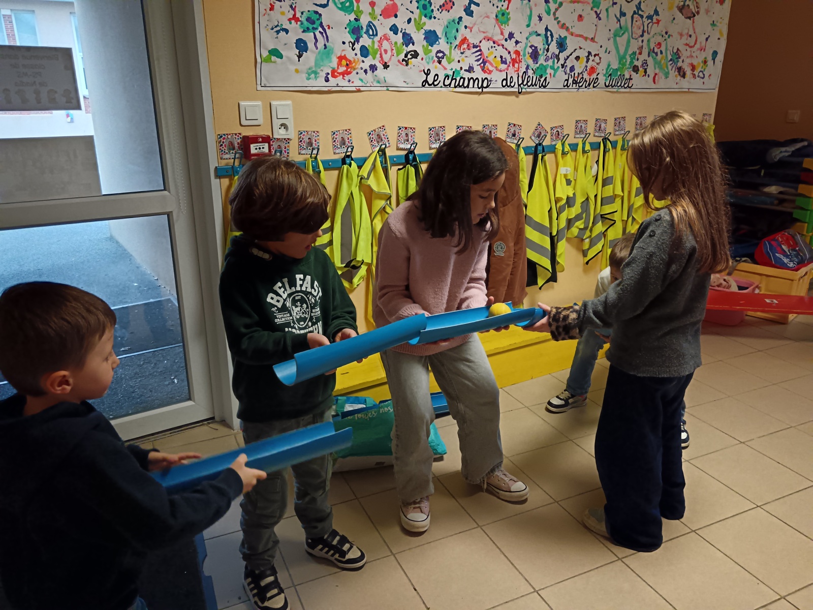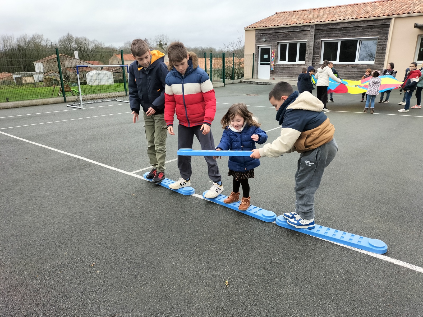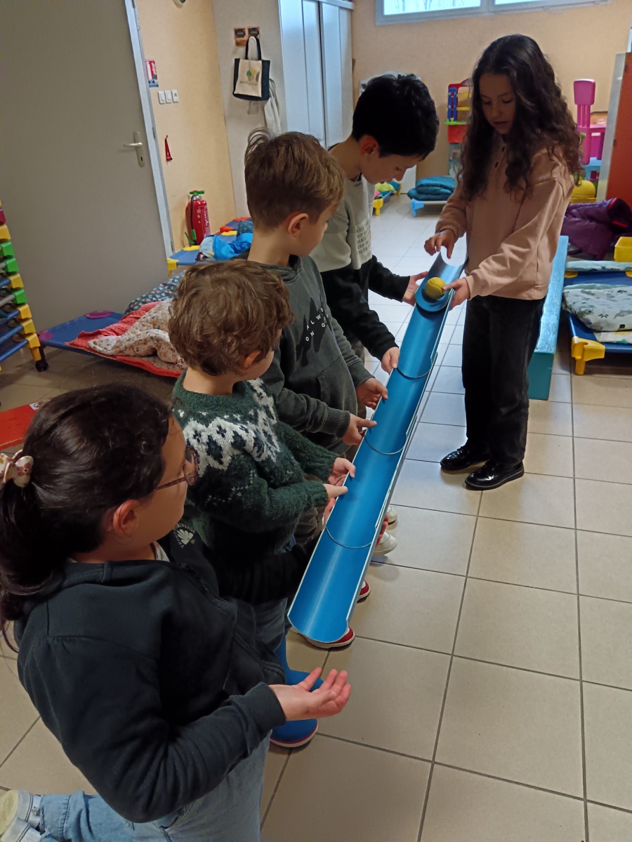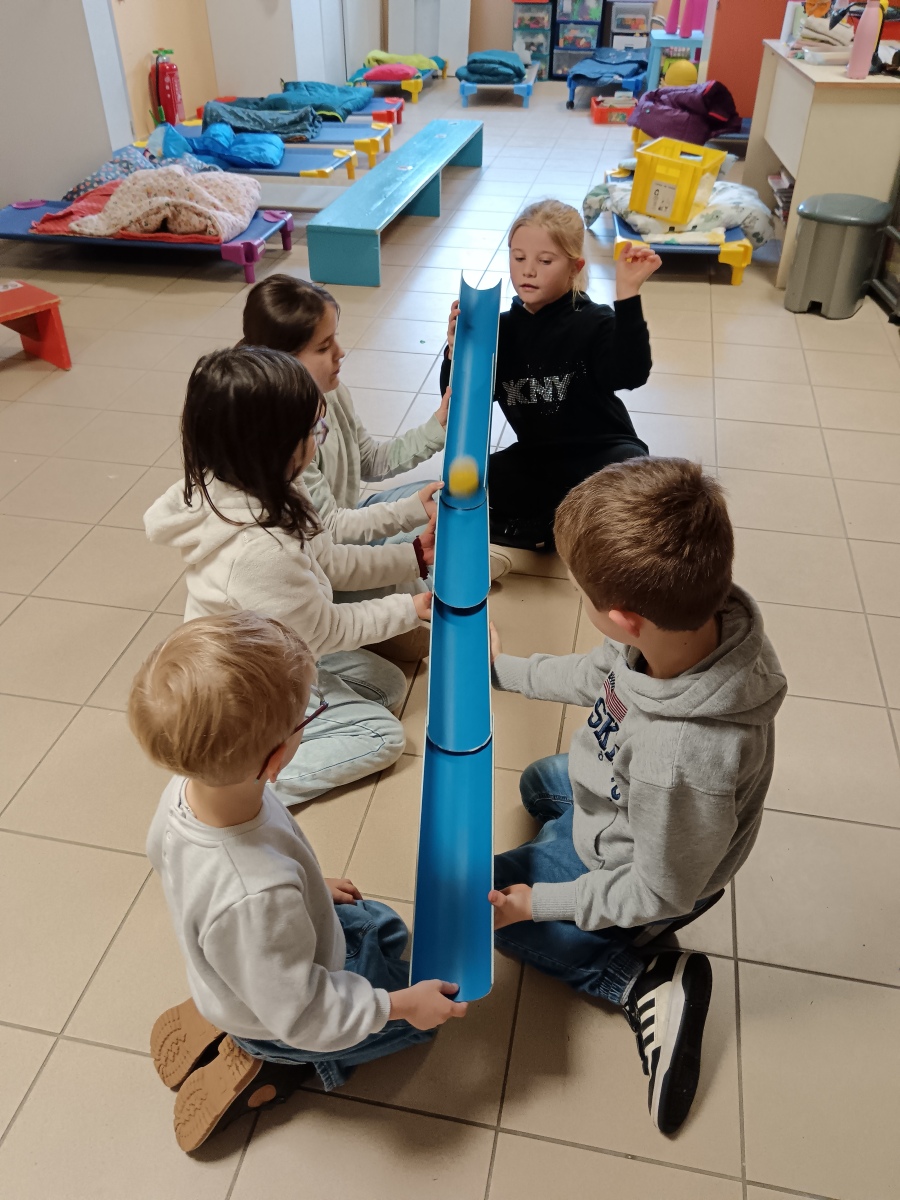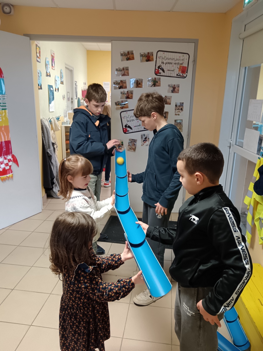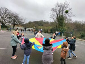 efforts dans différents ateliers de collaboration : tir à la corde, parachute, jeu de la gouttière, tours