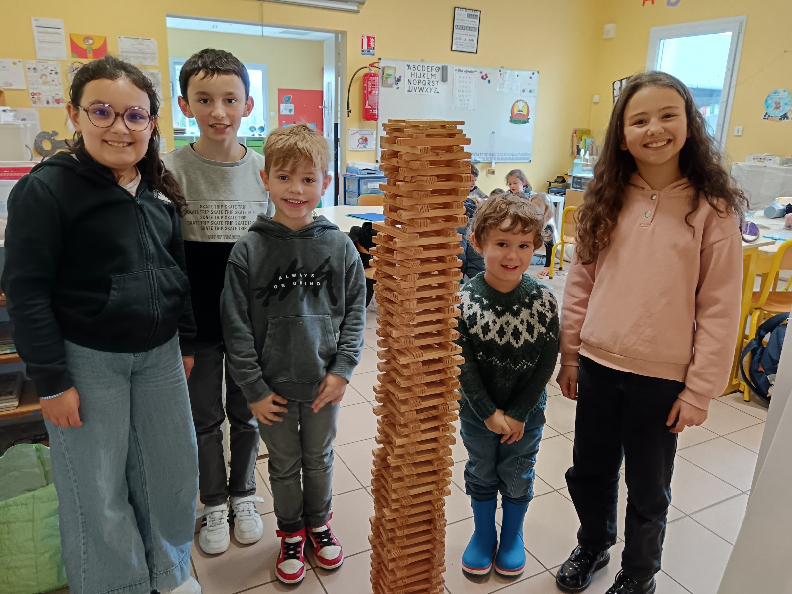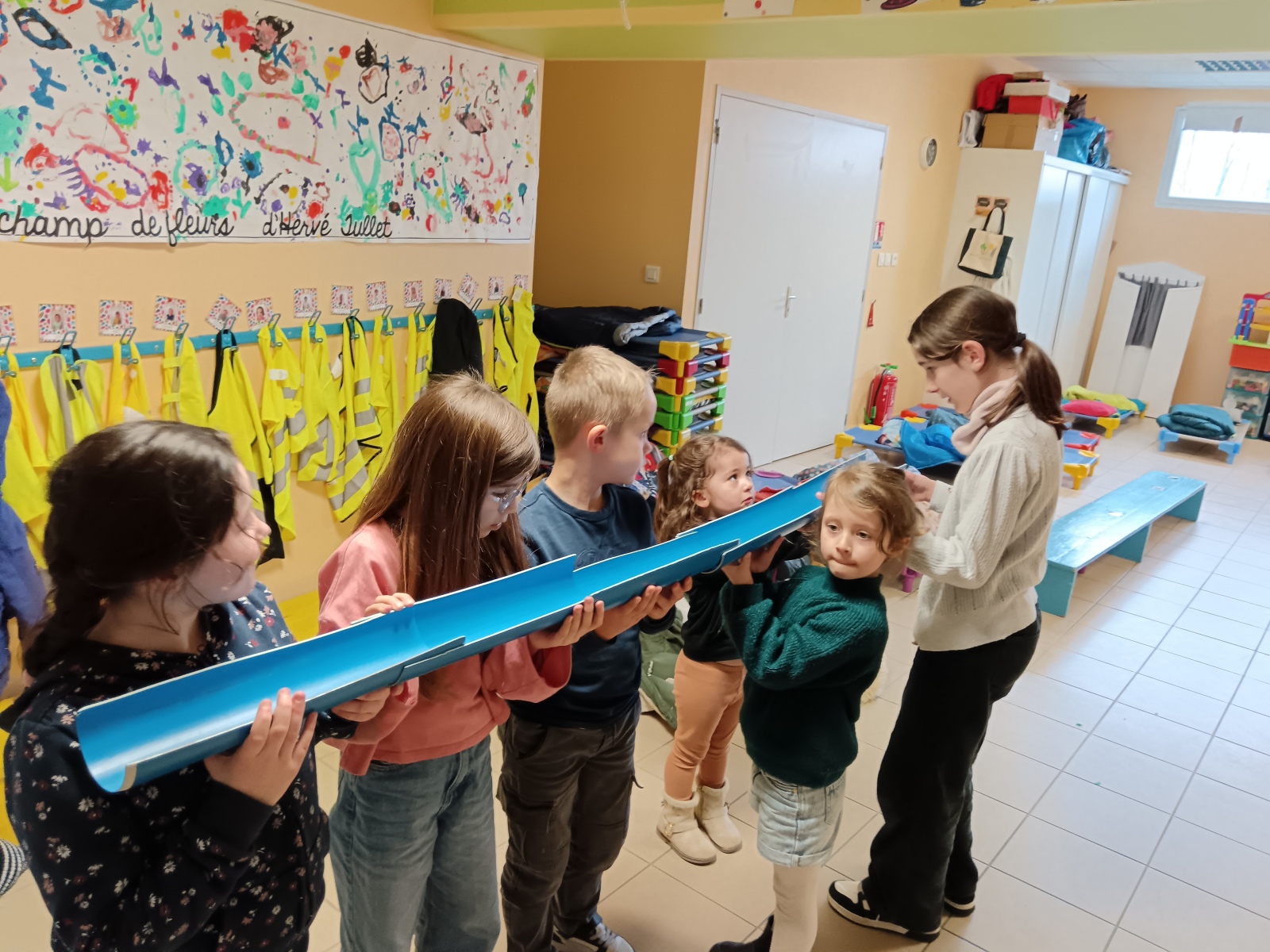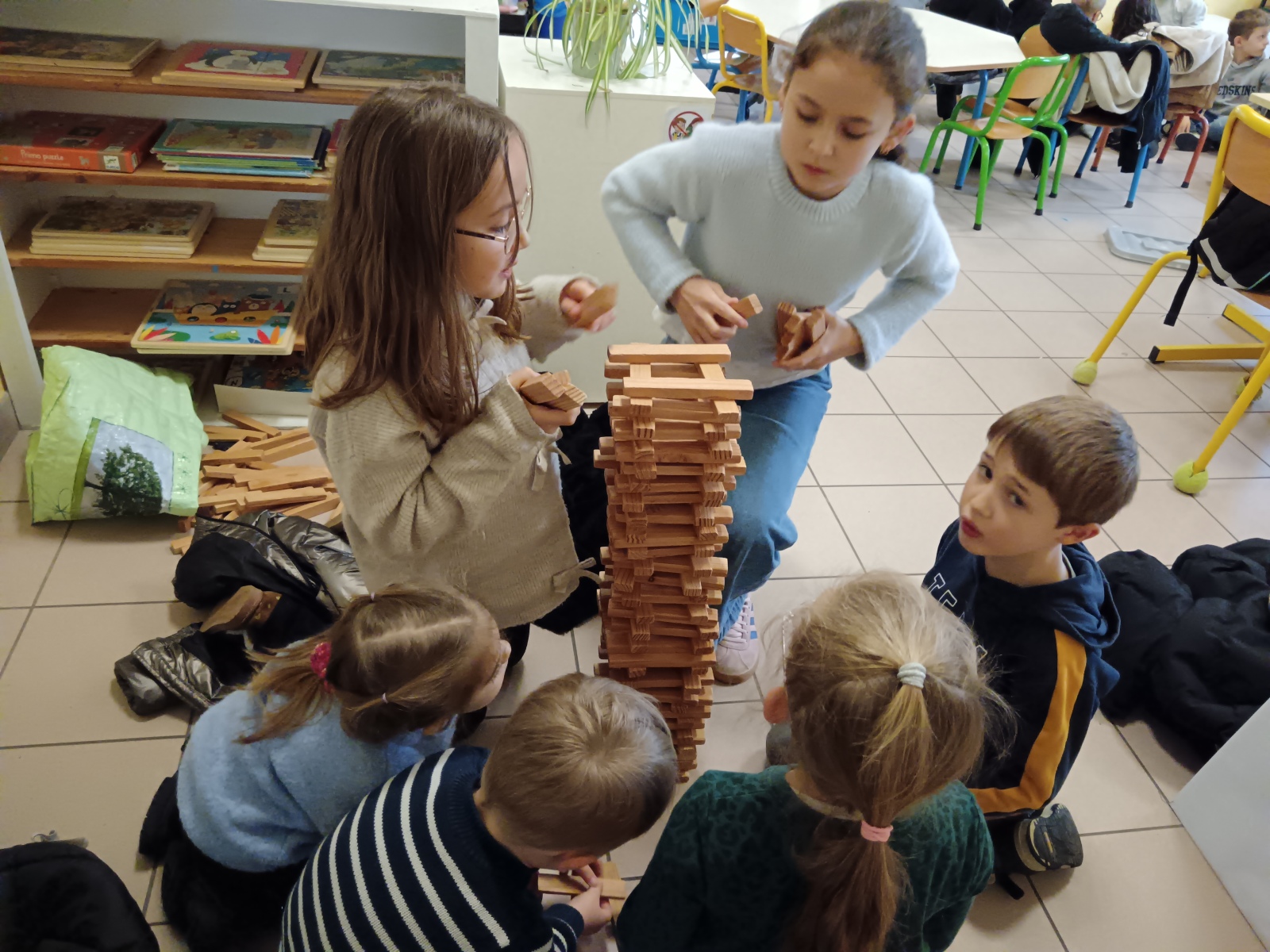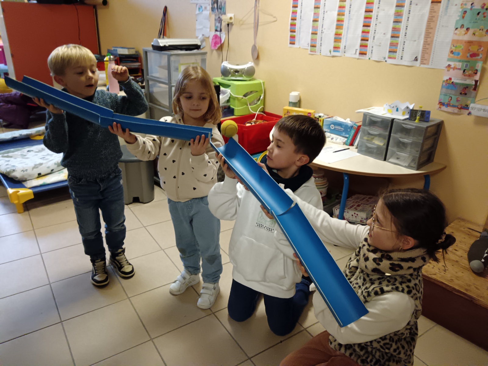 efforts dans différents ateliers de collaboration : tir à la corde, parachute, jeu de la gouttière, tours